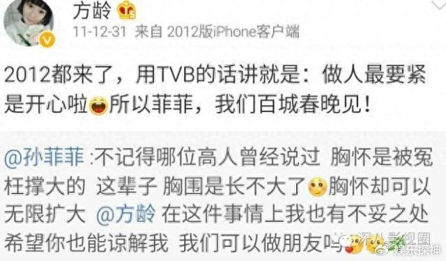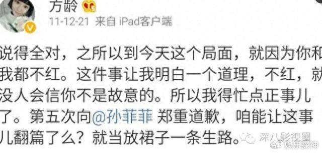 两天后,方龄在微博向孙菲菲道歉,表示愿意不穿胸贴被孙菲菲踩一次,
