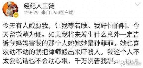 撕破脸后,孙菲菲方面没有公开回应,王薇在微博说受到了人身威胁,这件事情在头条待了几天,最后也没有。