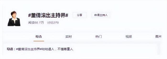 几年来,大家对于董倩采访风格的不满达到了顶峰,随着这次采访事件的发酵,网上出现了“董倩滚出主持界”的话题,网友们看到这个话题也纷纷来为增加热度添砖加瓦,最后,仅话题的关注量就达到了80多万。