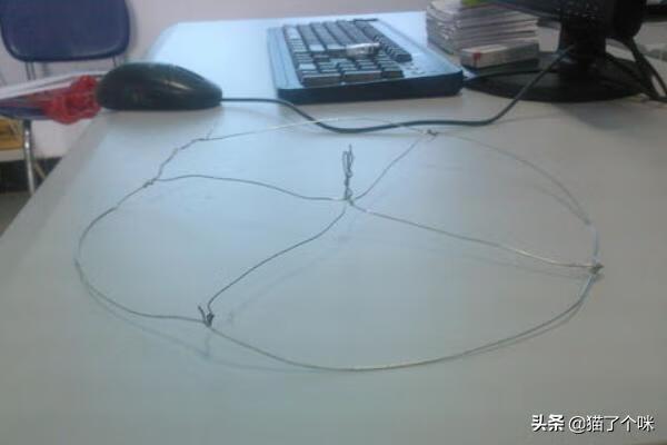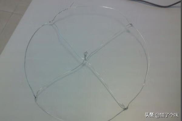 5、用老虎钳钳一段细铁丝出来,并将细铁丝弯成一个圆形,中间用铁丝固定成十字,并预留出放固体酒精的位置,如图: