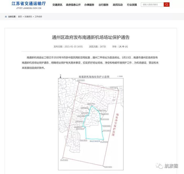 2020年9月,民航局批复南通新机场选址工程,南通市通州区二甲场址为首选场址。今年1月13日,南通市通州区政府发布南通新机场场址保护通告,明确场址保护有关具体事项为机场建设、营运和未来发展创造条件。