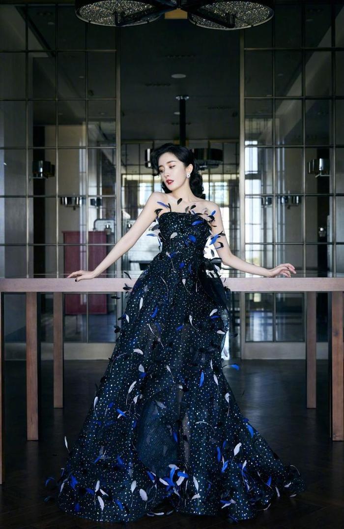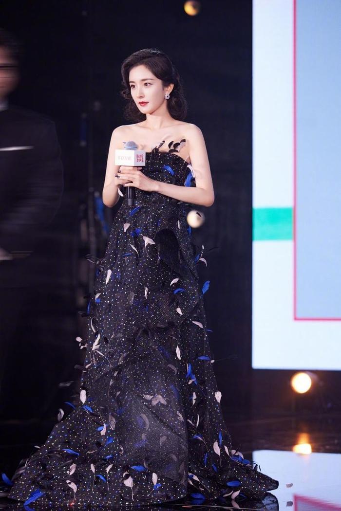 黑色为主的礼服一般是女明星们的首要选择,不仅出错几率为零,还能通过黑色的色彩魅力让自己的身型消瘦一圈。杨幂穿着一身裹胸的黑色长款礼服,三色拼接的羽毛镶嵌在礼服上显得仙气十足,让杨幂看起来不止气质脱俗,也更加有端庄、精致感。