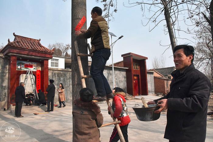 贴完院里贴院外,院门口贴上“出门见喜”或者“出门大吉大利”,院外的树上贴“根深叶茂”或者“树木兴旺”,并且贴树上的时候还要贴的高一些,这不他们又搬来了梯子。
