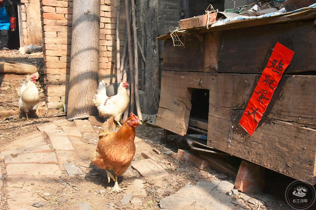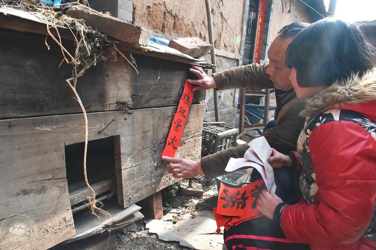 这个鸡窝上刚贴了“鸡肥蛋大”,就有几只老母鸡伸过头来看,好像她们觉得明年身上的“任务”又重了不少。