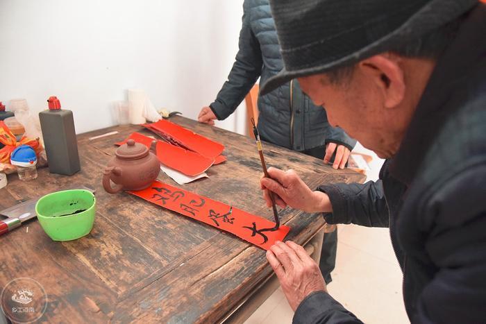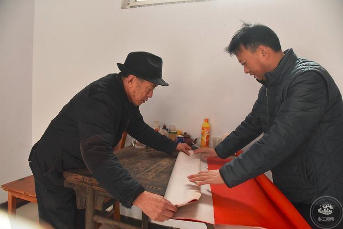 正在裁红纸的老人叫侯清周,是一位72岁的退休教师,可以说是村里很有文化的老者,今天由他执笔给村民们写春联。他说过去村里的春联都是手写的,家家户户去街上买一卷红纸,然后送到村里会写毛笔字的人家里,再交代好几扇门,这样大年三十就可以拿回来贴了。