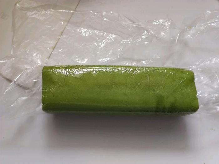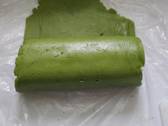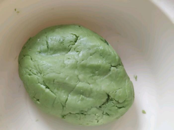 3、用上述同样的方式再做一个抹茶的面团,抹茶味的面团也一定一定要揉匀,面团揉好后也用保鲜膜包起来,不然面会干,用做曲奇的基础部分。
