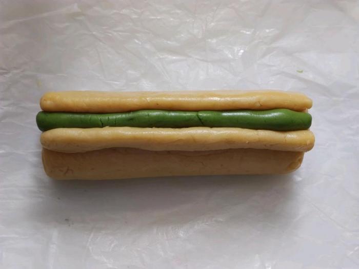7、拿出剩下的抹茶面团,将它擀成薄饼,大小要能正好包住曲奇的中间部分,多余的也可以剪掉,包好后用保鲜膜将其全部包裹住,用手轻轻的按压,按成长方体就可以了按压好后冷冻1个小时左右。