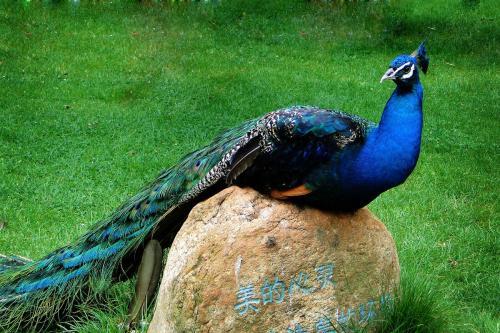 孔雀,头顶翠绿,羽冠蓝绿而呈尖形;尾上覆羽特别长,形成尾屏,鲜艳美丽;真正的尾羽很短,呈黑褐色。雌鸟无尾屏,羽色暗褐而多杂斑。蓝孔雀分布于印度和斯里兰卡;绿孔雀分布于东南亚,中国仅见于云南西部和南部,野生数量稀少,为中国国家一级保护动物。