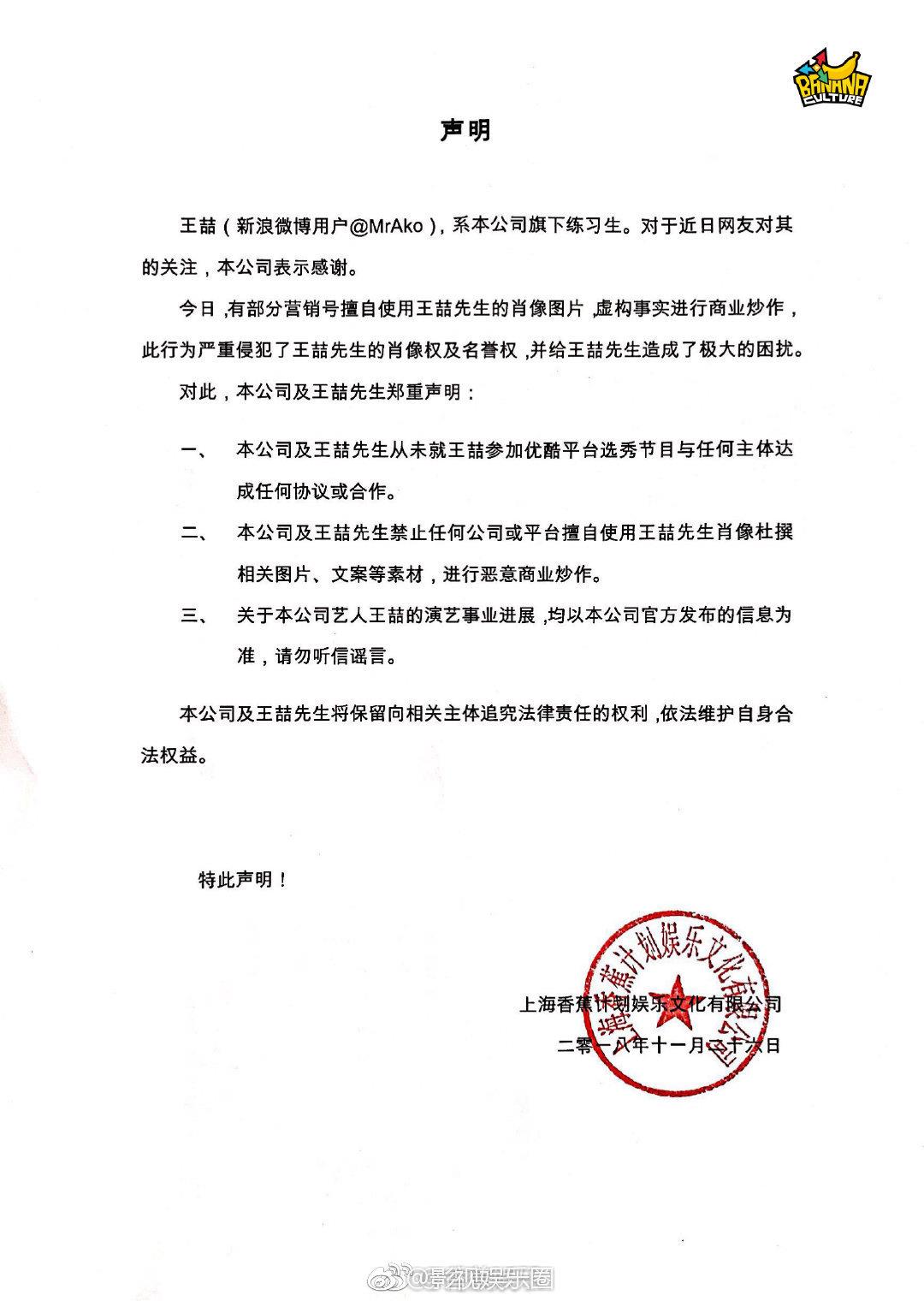 青春有你人气选手王喆曾一度在网络上被流传为王思聪表弟,作为香蕉计划在青春有你留下的独苗,果然十分受宠爱,还曾为王喆怼过优酷。王老板的加油没有缺席
