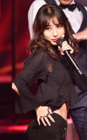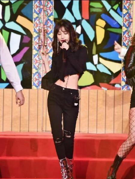 身穿黑色露脐装搭配黑色紧身长裤的李菲儿,身材曲线迷人,诱惑力满满