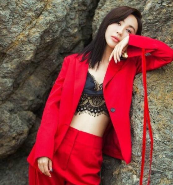 身穿黑色蕾丝背心搭配红色西装的李菲儿,柳弱花娇,满满都是诱惑