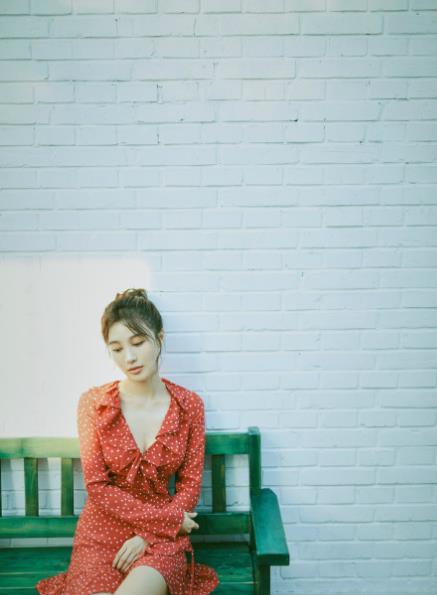 身穿红色波点裙的李菲儿,大秀事业线,性感迷人