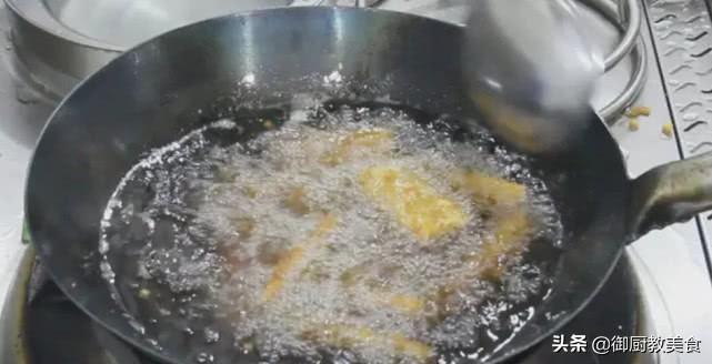 第五步,起锅倒入适量的食用油,将油温烧至5成热。把裹上干淀粉的带鱼段,用筷子夹着放入锅中进行炸制,第1遍炸制带鱼外表上色时捞出控油。再次将油温烧至八成热,然后把带鱼放入锅中进行复炸一次,直到将带鱼炸制外表呈金黄色时,即可捞出来控油装盘。