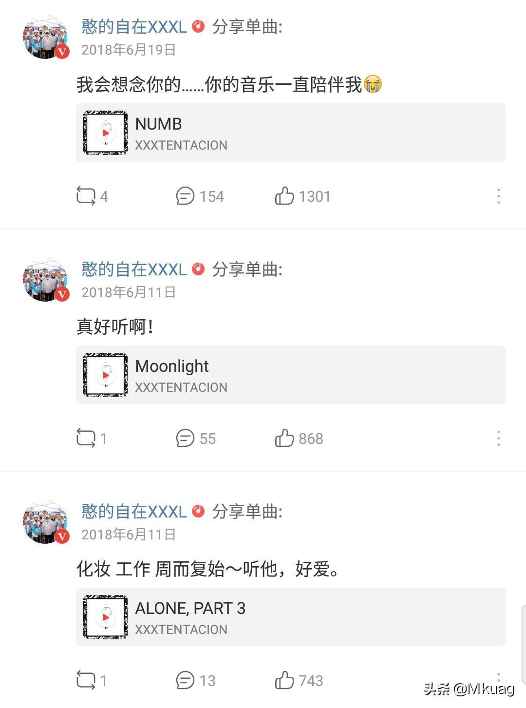有一次,韩红老师连续几条动态都是在分享 XXXTentacion 的音乐;得知 X 去世的消息,韩红老师也表达了她的想念之情。