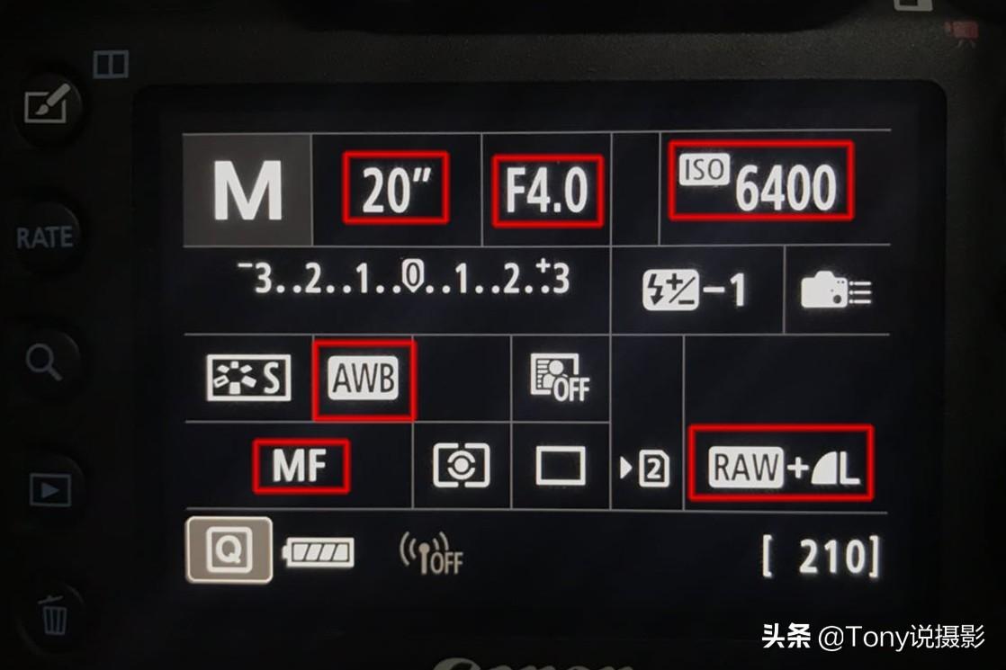 ⑤精准对焦完毕后,开始调整曝光参数:光圈开到最大,如F2.8或F4;快门速度设置为20秒或30秒;ISO是拍摄星空时控制曝光量的关键参数,根据拍摄环境光线可以在1600~6400范围内调整。