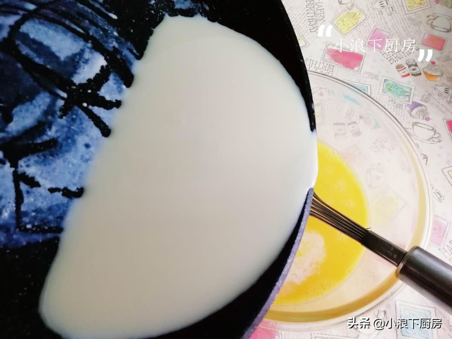 3、将加热好的牛奶缓慢倒入鸡蛋中,搅匀。