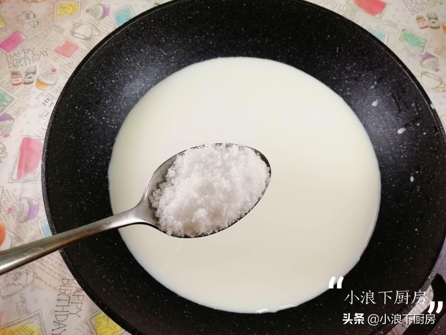 1、先将牛奶倒入小锅里,放上两勺白糖,小火融化。注意不要把牛奶烧开,保持在40°就可以了。40°是个什么概念呢?就是温水的感觉,热但是不烫手。