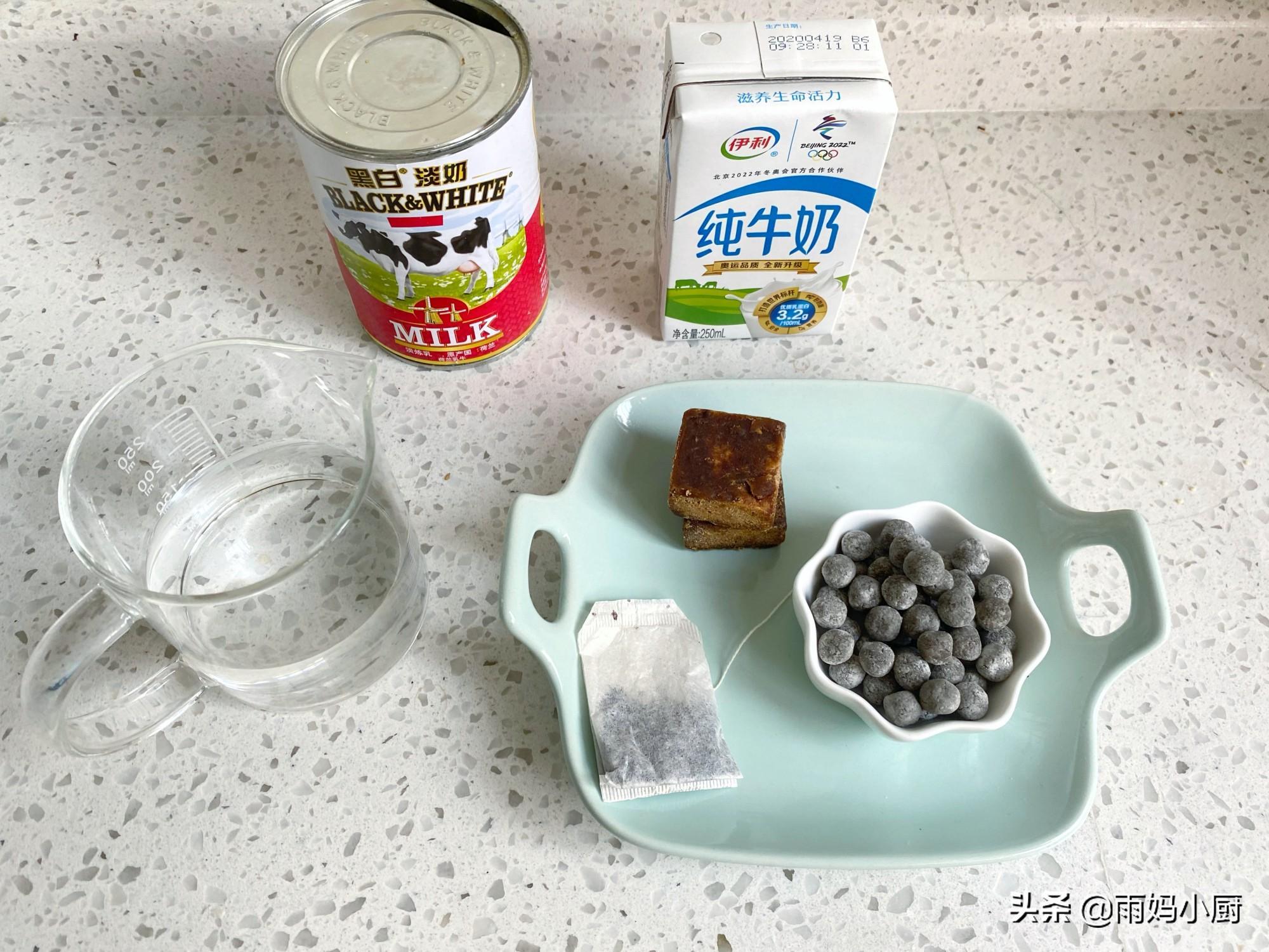 【食材】:立顿红茶1小袋(约2.5克),牛奶210克,水150克,黑白淡奶25克,免煮珍珠30克