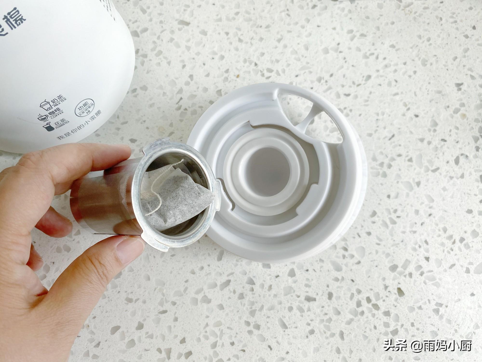 2、把红茶放入奶茶机的不锈钢过滤茶网里,旋紧防止漏出,没有茶袋的,也可以用直接把红茶放入茶网,煮好的奶茶一样不用过滤。