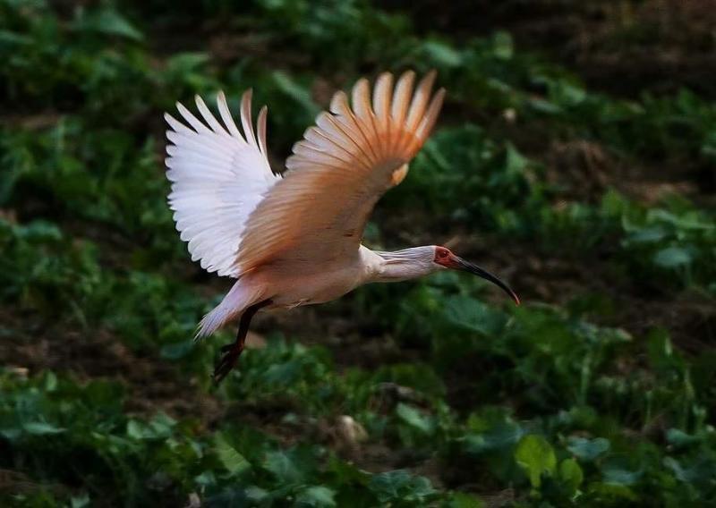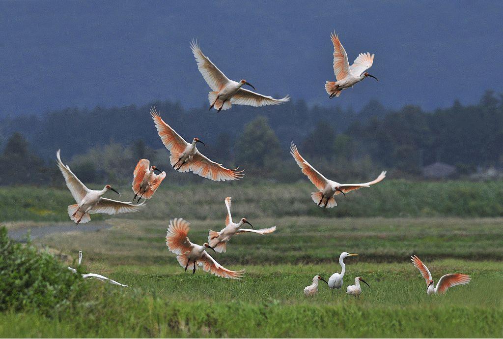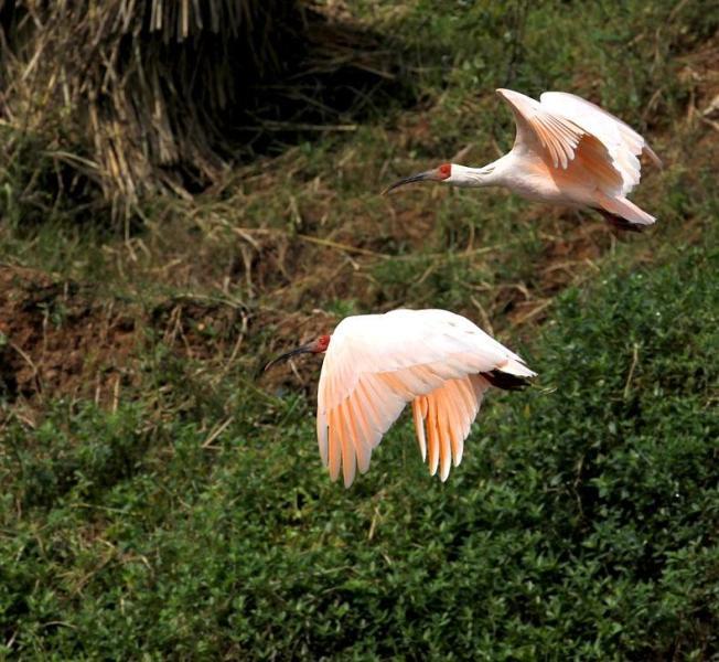 ②朱鹮生活在温带山地森林和丘陵地带,在非繁殖期通体白色,头、羽冠、背和两翅及尾缀有粉红色;