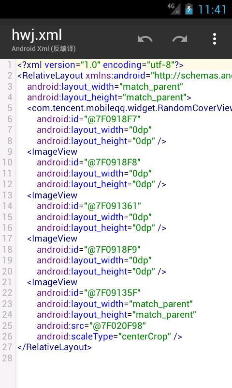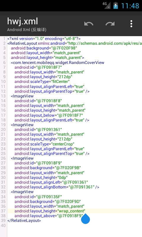 11、接下来进行侧滑背景的全局化修改。即编辑侧滑背景的xml布局文件。将刚刚修改好的安装包发送到手机上,在MT管理器中将其打开。在安装包上点击查看,然后找到R/o/hwj文件,点击反编译,将其编辑为如下所示(请仔细对比如下两张图的变化,限于篇幅,不再一一叙述,每个版本的QQ的资源ID是不同的,修改时注意改成对应的ID号):
