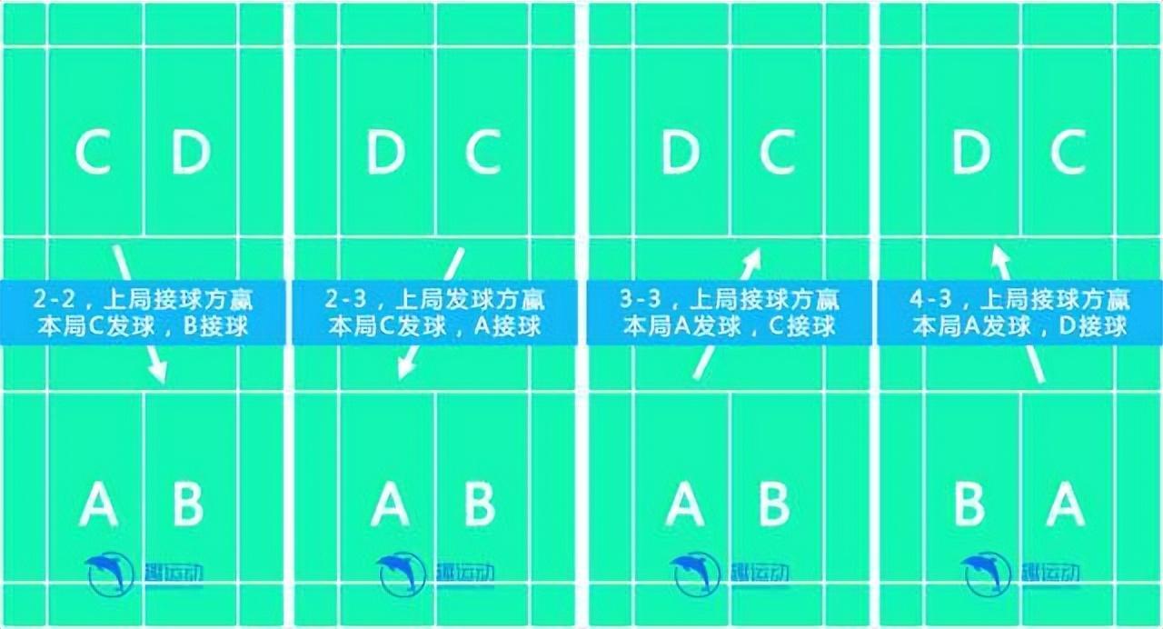 当发球方的分数为双数时(含0分),在右半场发球,否则在左半场发球;赢球的一方作为下一回合的发球方。