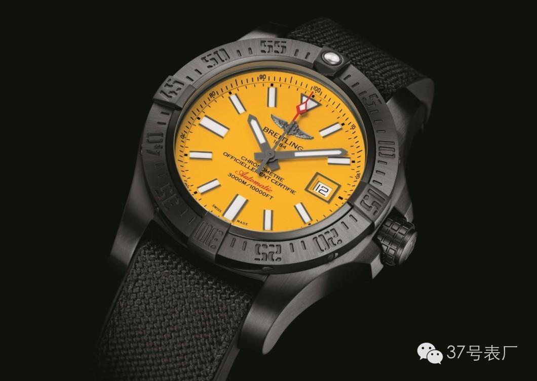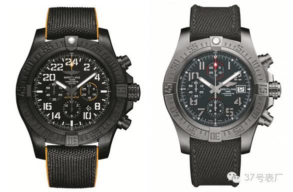 以及下面的“复仇者飓风腕表”(左)和“复仇者战机腕表”,走的都是“黑又硬”路线。左边这位有50毫米大表盘,但因用了百年灵家自己研发的比钛金属轻3.3倍的新材料Breitlight,故而上腕负担倒不是很重,24小时制也有浓厚的航空表风范;右边的用钛金属打造,45毫米表盘,观之更像一枚经典的“复仇者”。