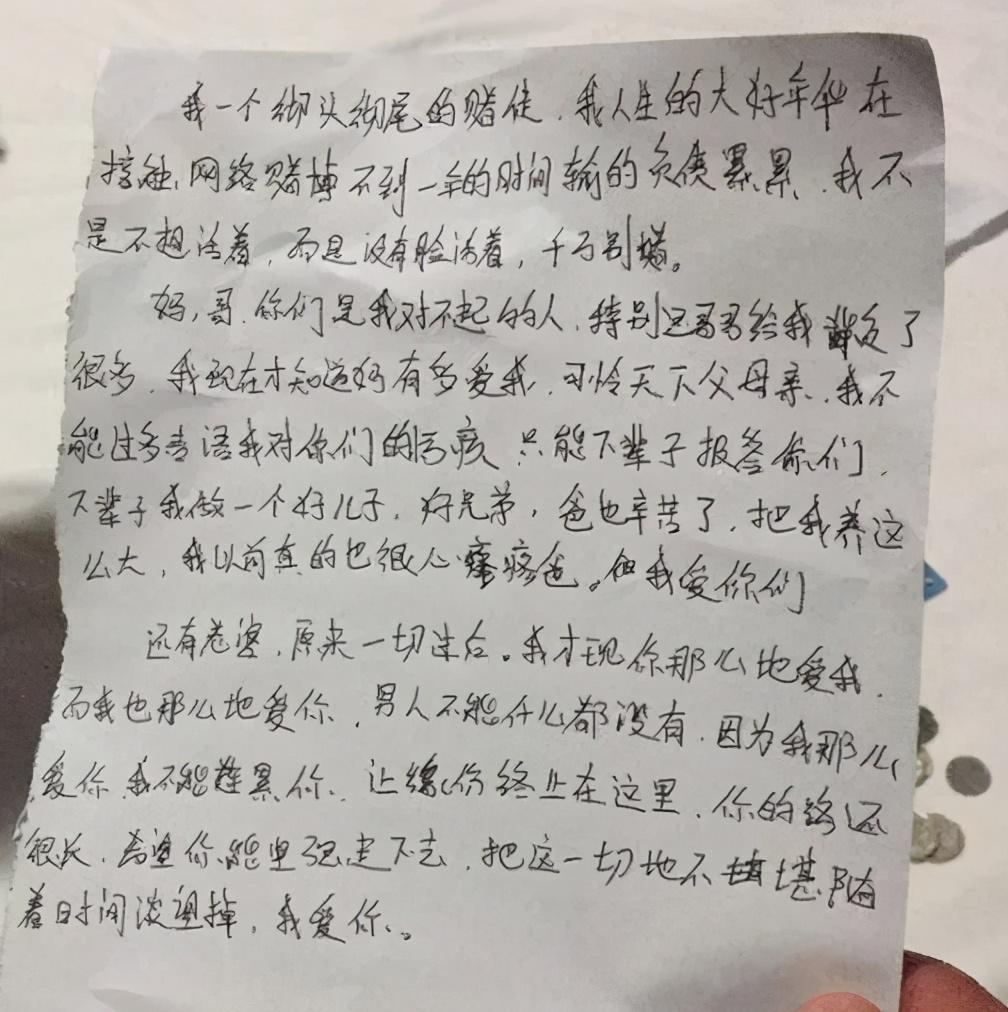 妈,哥,你们是我对不起的人,特别是男男给我背负了很多,我现在知道妈多爱我,可怜天下父母亲。我不能过多言语我对你们的愧疚,只能下辈子报答你们,下辈子我做一个好儿子,好兄弟,爸也辛苦了,把我养这么大,我以前真的很心疼爸,我爱你们。