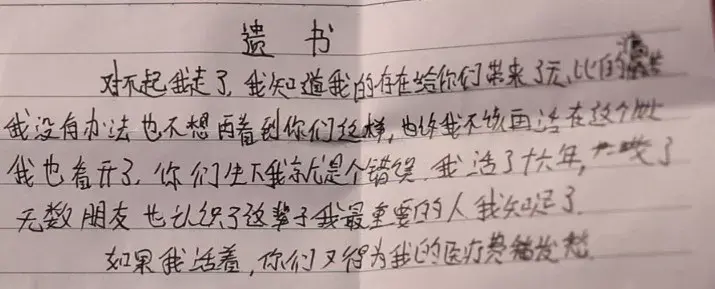对不起,我走了,我知道我的存在给你们带来了无比的痛苦,我没有办法,也不想在看到你们这样,也许我不该再活在这个世上,我也看开了,你们生下我就是个错误,我活了十六年,交了无数朋友,也认识了我这辈子最重要的人,我也知足了。如果我活着,你们又得为我的医疗费发愁。