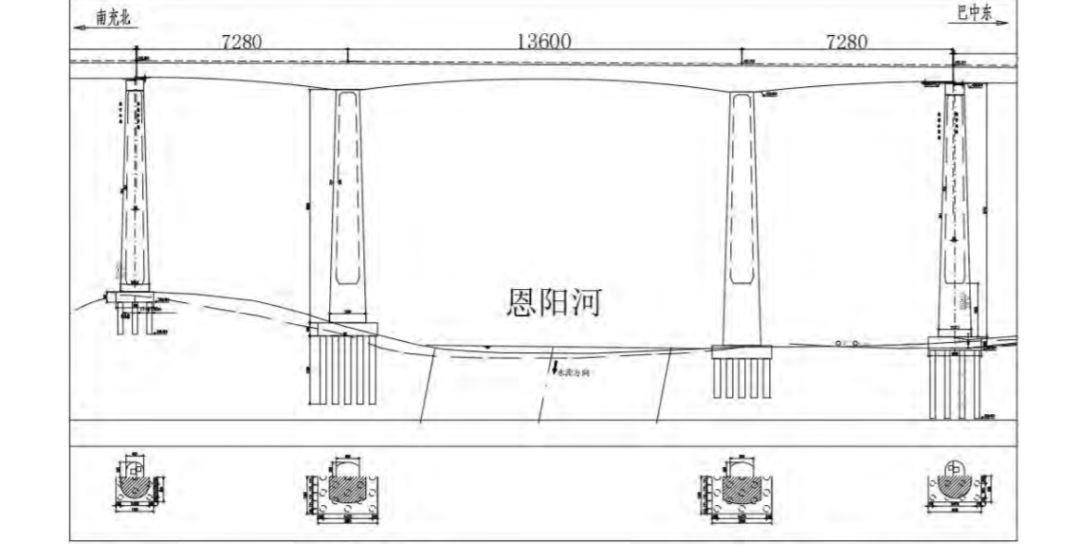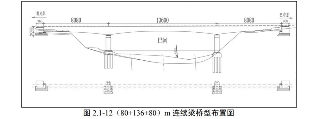 巴河大桥位于巴中市巴州区,桥址处为山区,地势起伏较大,植被较密。全桥孔跨采用( 80 + 136 + 80 ) m 连续梁,桥全长 317.10m 。