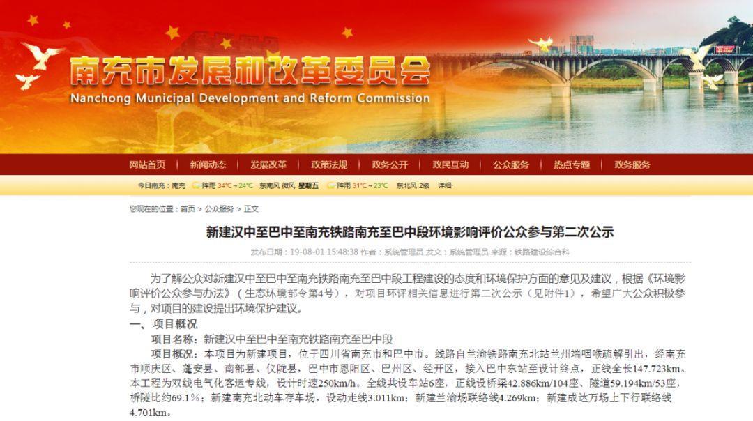 7月31日,巴中市发改委官网发布了一则公示信息《新建汉中至巴中至南充铁路南充至巴中段 环境影响评价公众参与第二次公示》,紧接着,8月1日,南充市发改委官网也发布了本次公示。