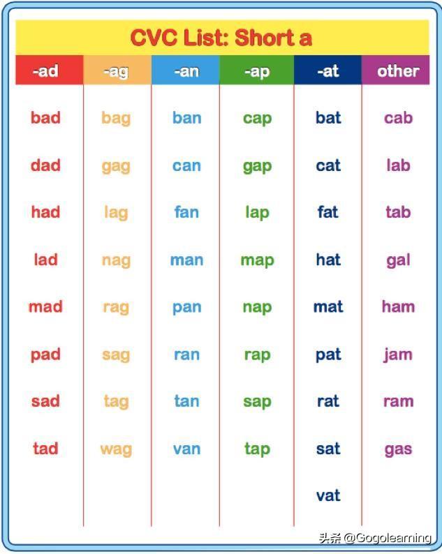 CVC单词中间必须有一个元音(a,e,i,o,u),也就是由这五个元音组成的单词,这些元音在CVC单词中,都发短元音。