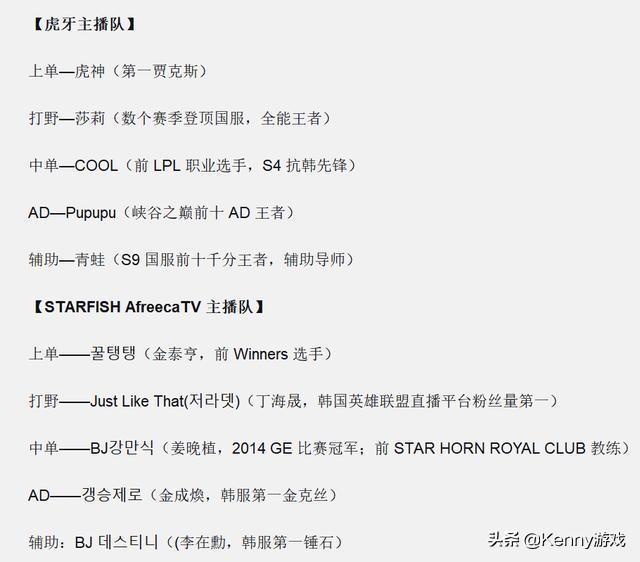虎牙这边可谓是牌面十足,都是来自国服的高端路人前职业选手,上路虎神(韩服第五,第一贾克斯)、打野莎莉(双服的高端全能王,精通各路英雄,英雄池也比较深)、中路无状态cool(前职业选手,早期的黑暗势力中的抗韩主力)、下路pupupu(国服高端ADC主播)、辅助青蛙(国服高端辅助主播,CD锤石创始人),另外打野和ad都是登顶过国服的主播。再看看AfreecaTV的阵容,上路金泰亨(前Winners职业选手),打野Just like that(AfreecaTV直播平台英雄联盟区最火主播,登顶过韩服的高端玩家);中单BJ(前职业选手,同时任职过职业战队的教练);ADC金成焕(也是前Winner职业选手,与金泰亨以前是队友关系);辅助李在勋(韩服公认的第二辅助,也是韩服第一锤石)。从双方的纸面阵容来看,虎牙这边的主播偏多,大多都是高端路人选手,只有无状态打过职业,AfreecaTV这边就不一样,主要还是以前职业选手为主力,路人选手也是牌面十足,双方有点职业选手对抗高端路人的意思。