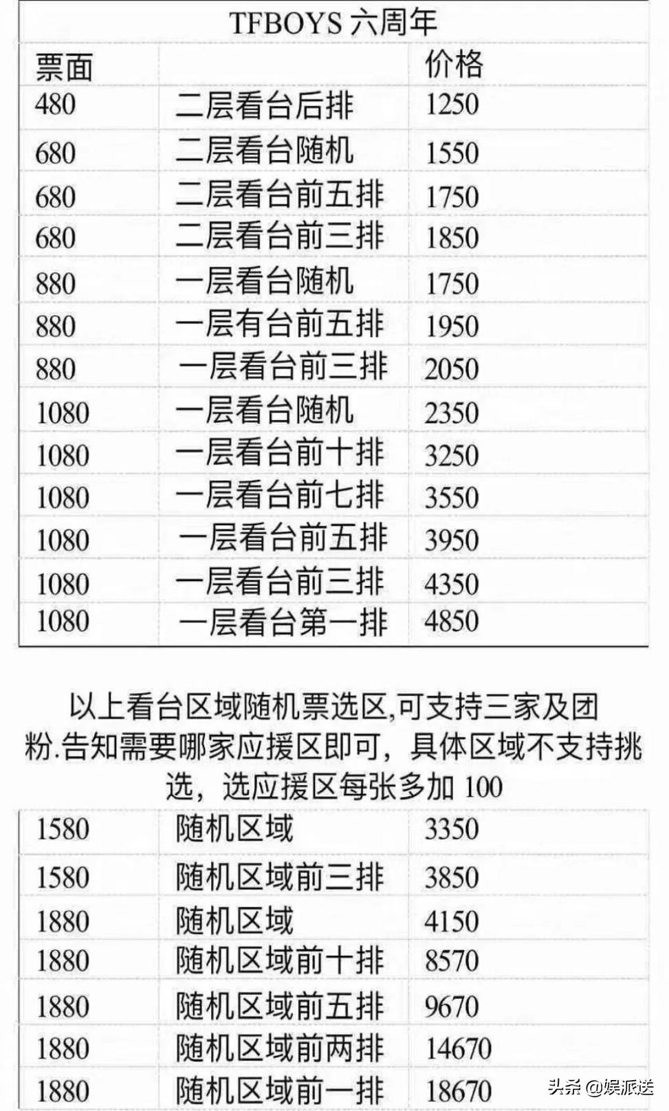 黄牛清清楚楚的开了一张价目表,看台680的1800,看台前五排4000,内场后区3800,内场前区5500,vip前五排1万,价格被黄牛肆意哄抬,高到离谱的价格让很多没有钱的真爱粉望而却步。