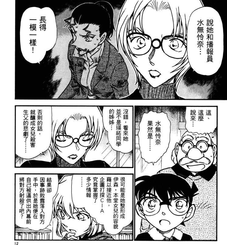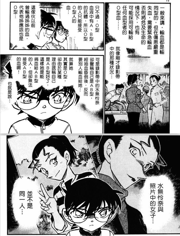 可情况出现了转机。柯南从护士那里了解到瑛祐小时候得过白血病,柯南又回想起在黄泉事件(TV493~494,拆分版540~541,惨叫、冥土)中看到瑛祐胸口处留下的伤痕,这才恍然大悟:瑛祐因白血病接受过骨髓移植,血型改变。瑛祐的姐姐其实就是水无怜奈。