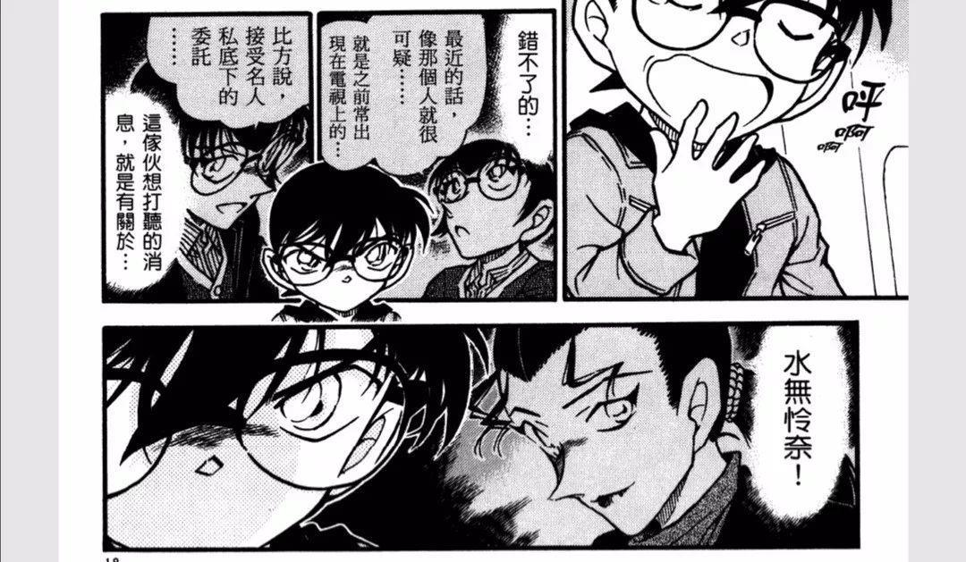 瑛祐询问小五郎有没有接受过名人私下的委托,柯南由此确定了他在刺探水无怜奈的有关消息。