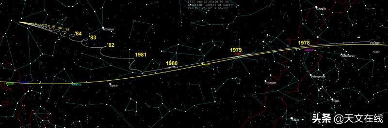 旅行者1号在1977-2030年间在地球天空中的飞行轨迹。来自托姆鲁恩/维基百科/牛津词典