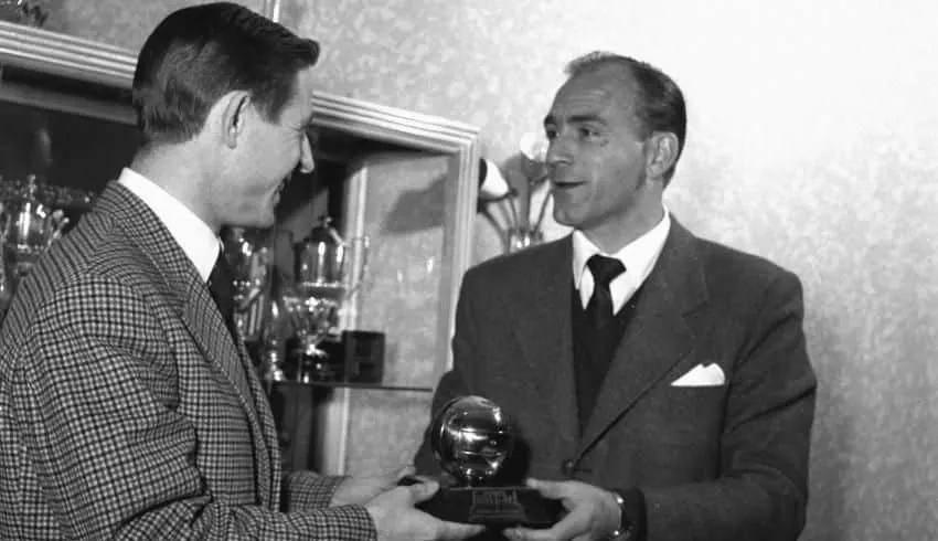 是1964年,迪·斯蒂法诺,时年39岁。迪斯蒂法诺是两届金球奖得主,分别是1957年的第二届、1959年的第四届。1958年的金球奖得主也是皇马球员,法国人科帕,但是科帕1959年即离开皇马回到法国兰斯俱乐部。