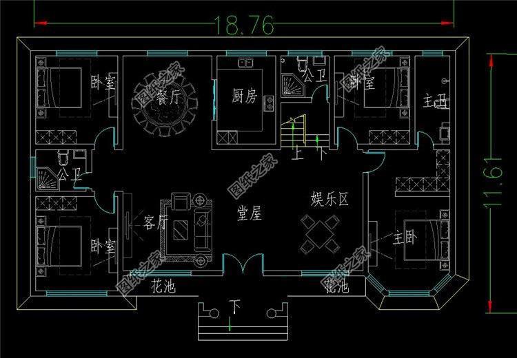 一层户型:堂屋、客厅、娱乐区、厨房、餐厅、卧室(带衣帽间、卫生间)、卧室x3、卫生间x2;