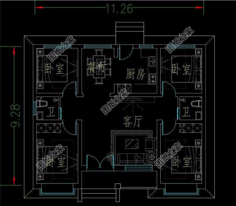 占地面积:11.26m*9.28m,104.951平方米左右;建筑层高:一层;建筑高度:6.13米(含屋顶);设计功能:一层户型:客厅、厨房、餐厅、卧室x4、卫生间x2;