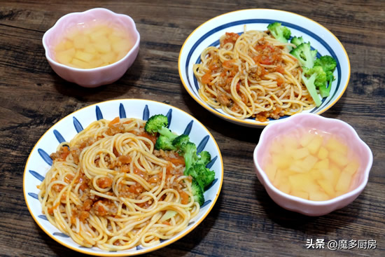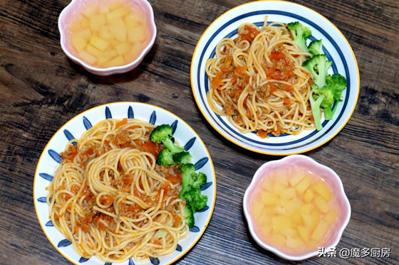 学校的午餐很少会有意面,我家两个孩子又很喜欢番茄肉酱面。所以每周我都会在家安排一次,自己做的番茄肉酱不油不腻更好吃,再搭配水果茶,暖暖和和的,孩子们喜欢,我做起来也不费事。