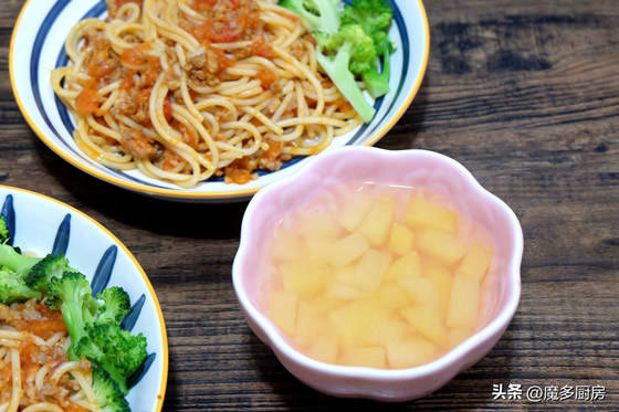 小朋友晚饭简单做,妈妈自制番茄肉酱面,搭配苹果茶,吃得舒服
