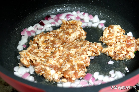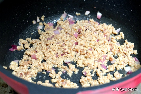 5、肉馅经过翻炒后会散开,变色,味道也会更香;