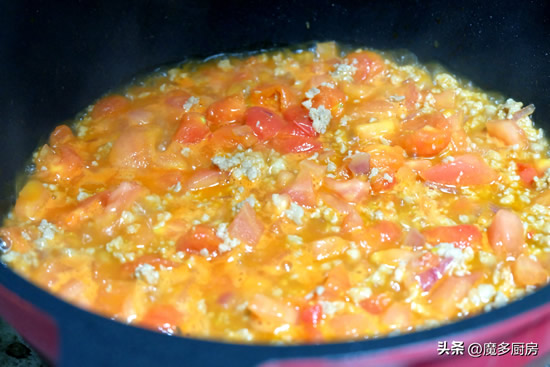 7、很快番茄就变得汤汁丰富,块头缩小了。