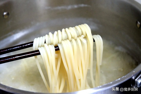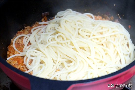 12、煮好的面条放到番茄肉酱锅里,一起翻炒均匀;