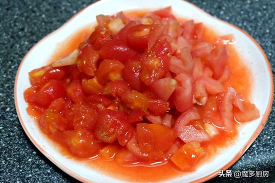 2、把去皮的番茄再切成小块,更方便烹饪时制作成酱;