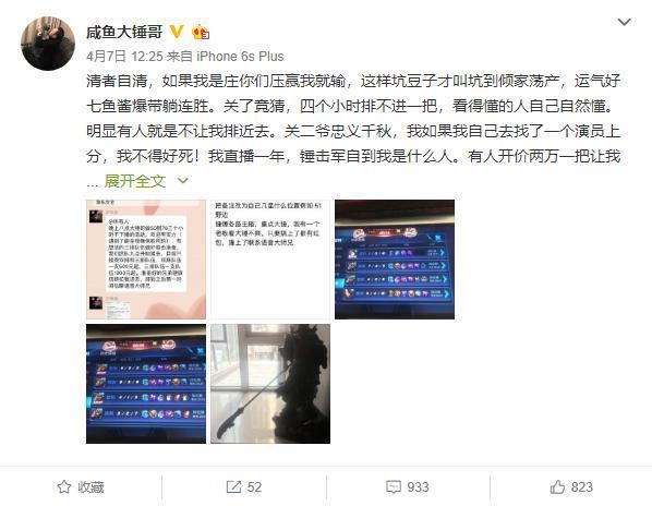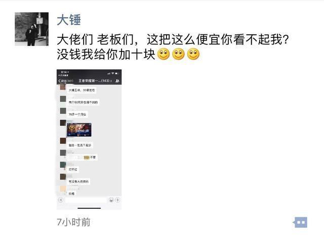 大锤哥作为国服第一关羽,虽然在直播的时候经常打娱乐局,但是凭借自己的超强实力,可以轻松碾压,根本不需要请演员帮助自己.从大锤哥公布的照片来看,大锤哥也受到过演员的狙击,而且一把的价格为5000,调皮的大锤哥还在嘲讽到要不要加多10块钱给他们.