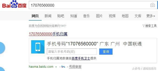 以上就是虚拟运营商的充值方法,其实这些方法当然用到最多的就是要知道号码是那家运营商的。查询就成了关键的问题。目前百度和360搜索出来的结果都不太令人满意。我们可以对比一下一个号码:17076560000 百度搜索结果