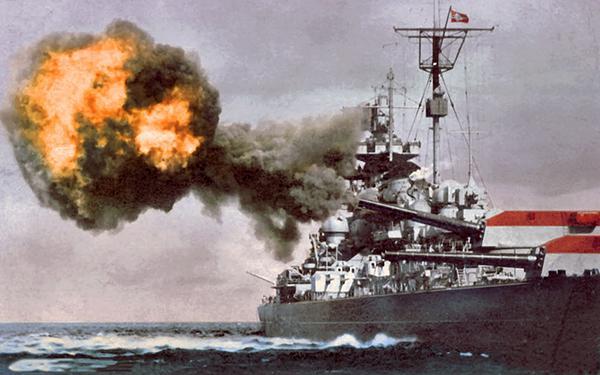1941年5月18日,该舰与“欧根亲王”号重型巡洋舰奉命出航,企图进入大西洋破坏英国海上交通线。24日上午在丹麦海峡附近同英舰交火,凭借着强大的火力优势,先后击沉英国海军精神象征“胡德”号巡洋舰,击伤“威尔士亲王”号战列舰。