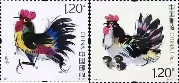 2017年 丁酉年鸡票一套两枚,全套邮票延续了第四轮生肖邮票主推的“合家欢“主题